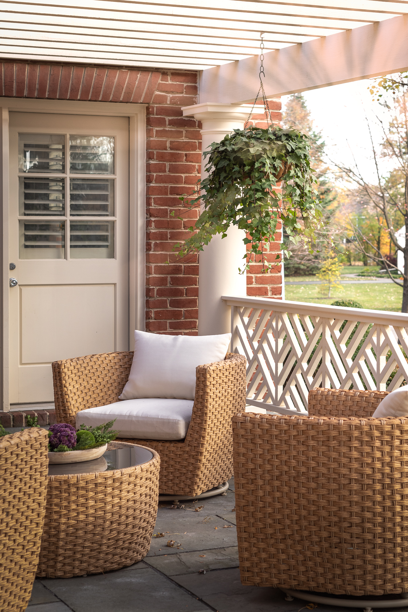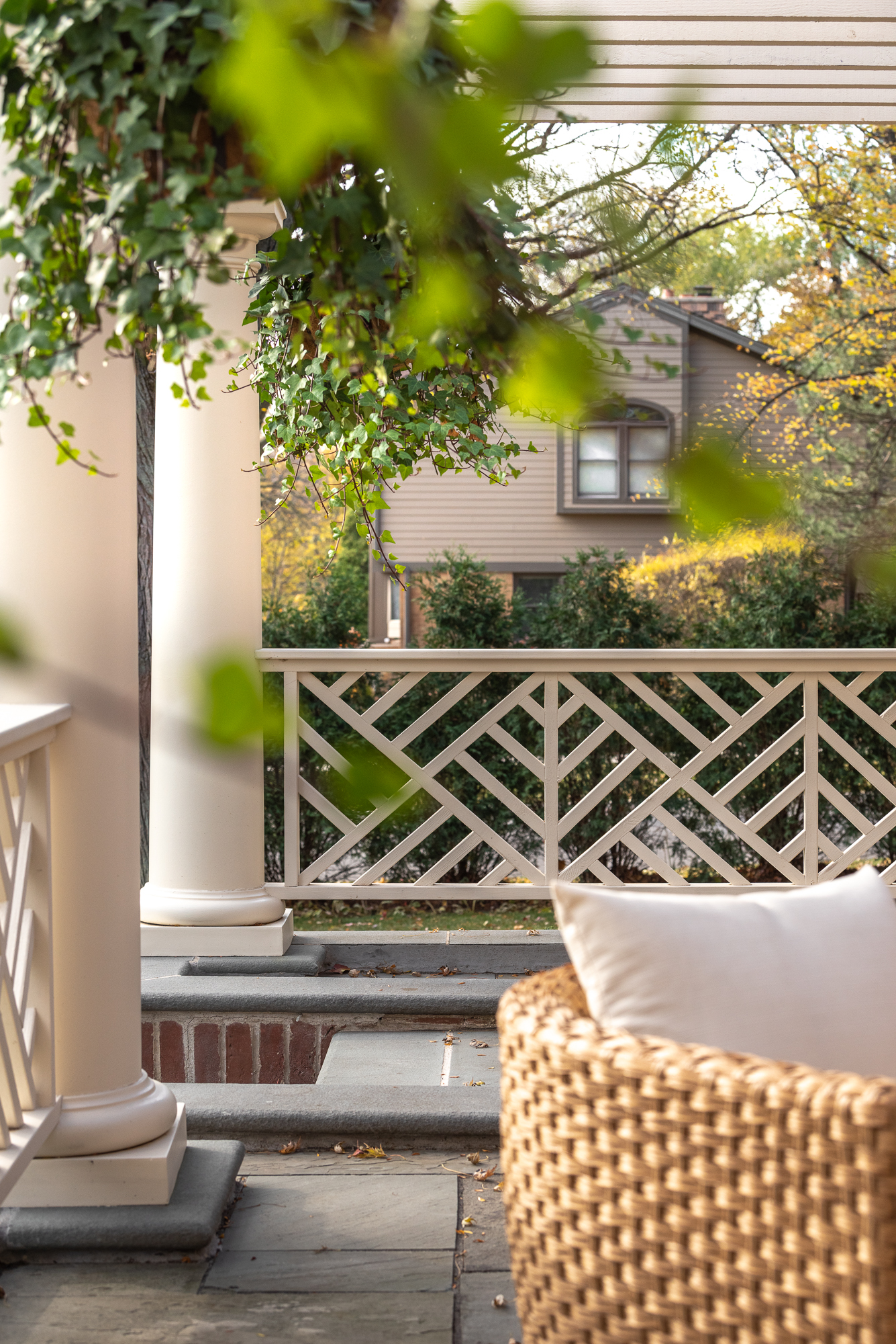This view captures the softer side of the pergola terrace, where layered greenery and comfortable woven seating create a relaxed, inviting atmosphere. The custom railing adds beautiful pattern and architectural interest, while the bluestone steps guide the flow between gathering areas. It is a space that feels both elegant and easy, perfect for lingering conversations and quiet moments outdoors.