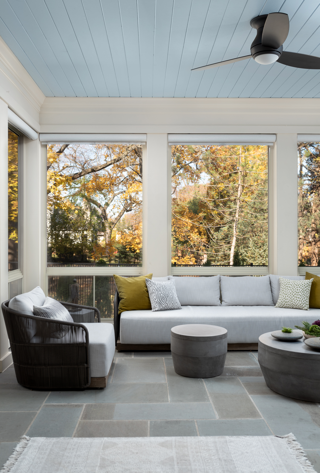 Bluestone floors and a paneled ceiling bring warmth and texture to this porch retreat.