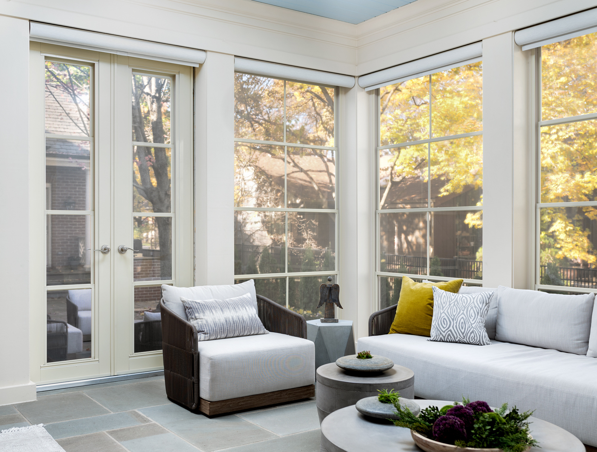 The double doors create an easy connection from the screen porch to the patio. The flexible window panels can be closed, opened, or set midway for the perfect balance of fresh air and protection, shown here in the closed position. This makes the porch ideal for cozy upholstered seating in a bright, protected space.