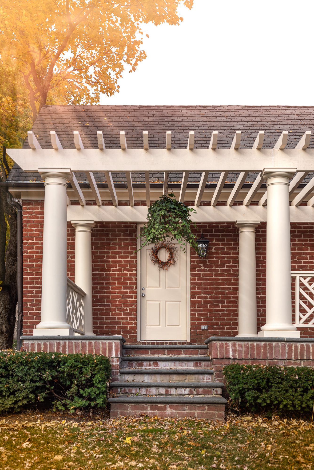 Architectural columns and layered brick details create a timeless terrace entrance.
