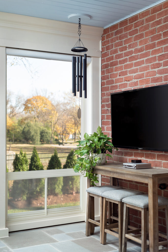 This corner of the screen porch layers comfort with thoughtful material detail. The shiplap ceiling adds subtle texture and architectural warmth above, while the brick wall and bluestone tile floor bring timeless character and durability underfoot. With the television tucked into the corner, it becomes the perfect spot for lazy Sunday afternoons, whether watching the game, enjoying a movie, or simply relaxing with the view just beyond the windows.