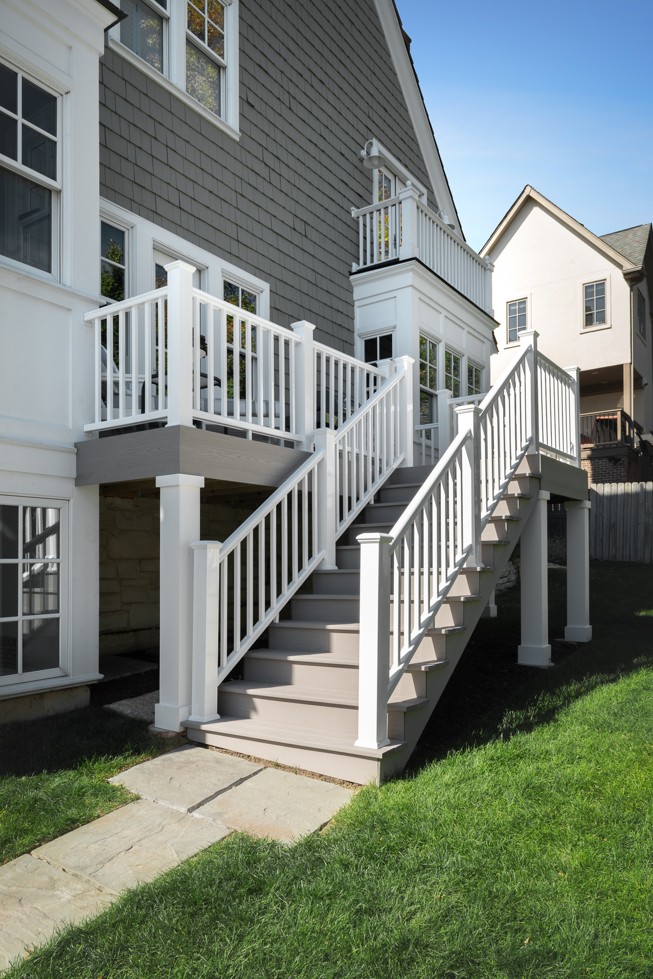 This view from the walkway up the stairs highlights how naturally the deck functions as the back entrance to the home and the closest connection to the kitchen. It creates an easy everyday path for carrying food out to the grill, stepping down to the patio, or moving into the yard. As a final layer to this outdoor space, the deck brings together beauty, durability, and effortless function as a true extension of the home.